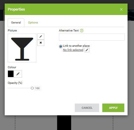 Under properties, you will discover a few option. You can link you image to an alternative website / link the image to one of your websie pages / link image to email or contact. Should you wish for the image to open in a new window, click on the "open in new window" box.