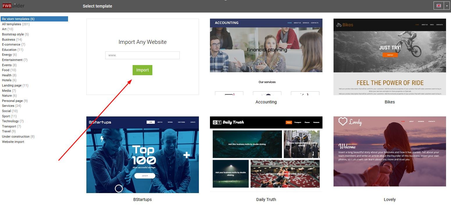 Once you login to your builder, you will be directed to the template options. Click on the box with the "www" under the Import any website.